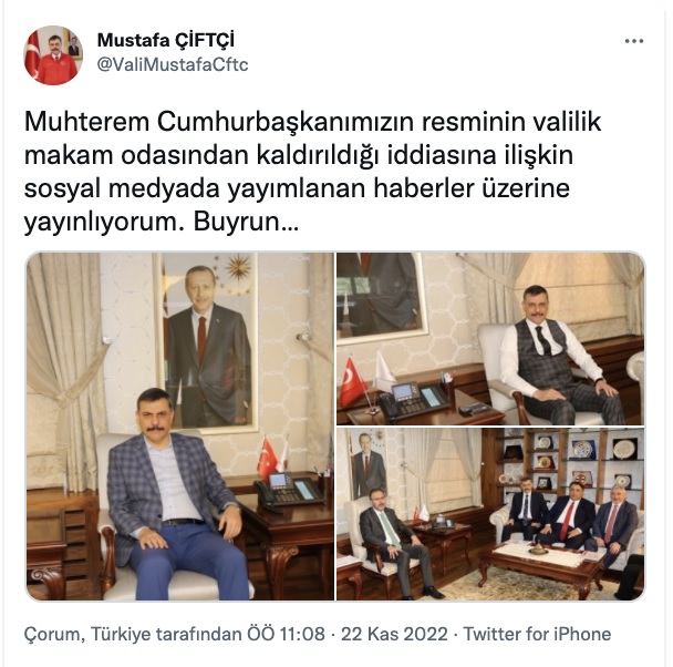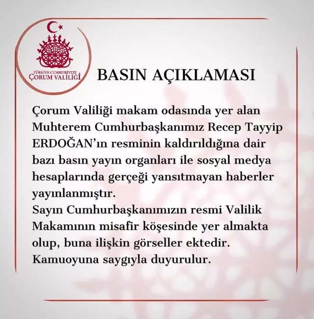 Çorum Valisi Mustafa Çiftçi'nin Cumhurbaşkanı Erdoğan'ın fotoğrafını makam odasından kaldırarak sadece Gazi Mustafa Kemal Atatürk'ün portresini bıraktığı iddialarının gerçeği yansıtmadığı ortaya çıktı. Sosyal medyada hızla yayılan iddialar sonrası Çorum Valiliği'nden fotoğraflı açıklama geldi.