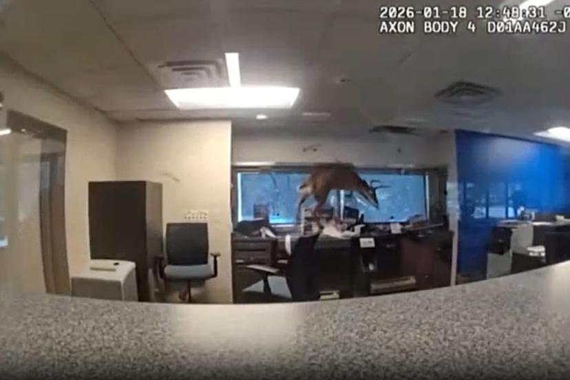 Polisten gelen bir video, bir geyiğin bir bankanın camını kırıp içeri daldığını ve polis memurları onu kontrol altına almaya çalışırken ortalıkta başıboş koştuğunu gösteriyor.