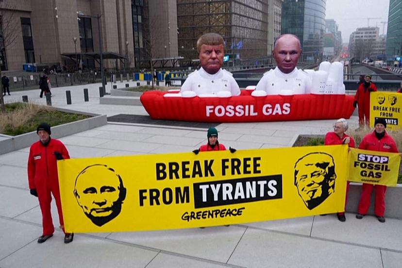 Greenpeace, Brüksel'de Trump ve Putin maketleriyle AB'ye çağrı: fosil yakıt bağımlılığına son