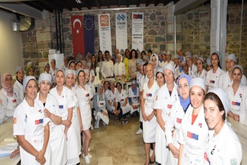 İzmir Büyükşehir Belediyesi’nin restore ederek yeniden hayat verdiği 109 yıllık Meslek Fabrikası binasında gerçekleştirilen finansmanı Avrupa Birliği ve Türkiye tarafından sağlanan, Ege Bölgesi Sanayi Odası, İzmir Pastacılar Fırıncılar Derneği ve İtalya’dan Milano Ticaret Sanayi Odası- Formaper ortaklığında yürütülen kurs, hafta içi her gün devam ediyor. 100 kadının katıldığı eğitimlerde klasik Türk mutfağı lezzetlerinin yanı sıra şeker hamurundan yaptıkları çizgi film karakterli pasta ve kurabiyelerle parmak ısırtan kursiyerler, 8 ay süren eğitimin sonunda pastacılığın püf noktalarını öğrendikleri gibi sertifika almaya da hak kazanacak.