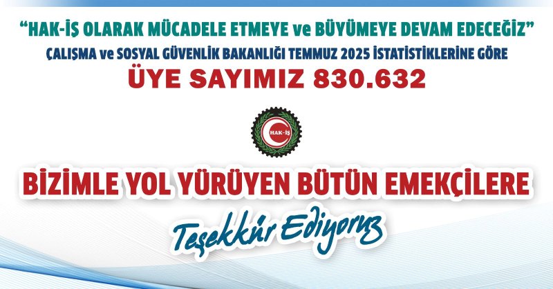 HAK-İŞ Konfederasyonu İzmir İl Başkanı ve HİZMET-İŞ Sendikası İzmir Şube Başkanı Gültekin ŞİMŞEK, 2025 yılı ikinci dönem sendikal istatistiklere ilişkin olarak yaptığı değerlendirmede, HAK-İŞ Konfederasyonu’nun işçilerin takdirini ve güvenini kazanmaya devam ettiğini, bütün zorluklara ve baskılara rağmen, Türkiye’nin en büyük işçi konfederasyonu olma yolunda emin adımlarla ilerlediğini belirterek, “Bize inanan, güvenen, bizimle yol yürüyen, HAK-İŞ davasına gönül veren emekçi kardeşlerimize teşekkür ediyoruz. Daha güçlü bir Türkiye ve daha güçlü bir HAK-İŞ için sendikasız bütün işçileri HAK-İŞ çatısı altındaki sendikalarımızda örgütlenmeye davet ediyoruz” dedi.