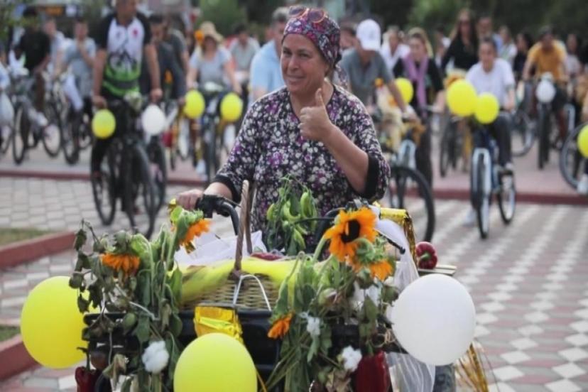 Vatandaşlar, bisikletlerini kuru domates, patlıcan, biber, mısır, ayçiçeği ve pamuk ile süsledi. Hasat ürünleriyle süslenmiş bisikletleriyle sokakları turlayan vatandaşlara ilgi yoğundu.
