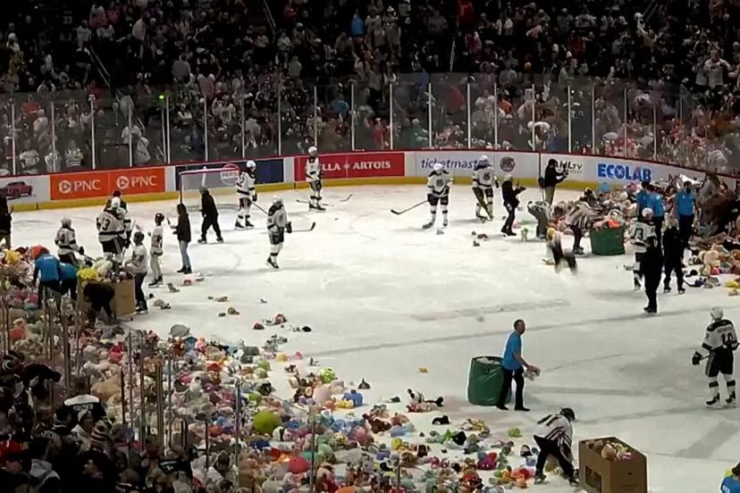 Video. Hershey Bears taraftarları bağış için buzun üzerine 81 bin 796 peluş oyuncak attı; oyun kısa süre durdu. Hershey 5-2 kazandı; etkinlik 60’tan fazla yerel hayır kurumuna destek sağladı.