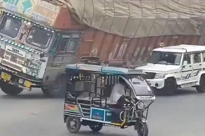 Hindistan'ın Uttar Pradesh eyaletine bağlı Rampur'da talaş yüklü kamyon, dönüş yapmaya çalışan ciple çarpışmamak için ani manevra yaptı.