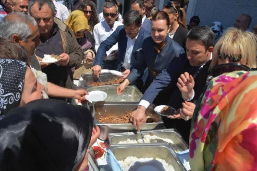 İzmirli vatandaşların yoğun ilgi gösterdiği pilav dağıtma etkinliğinde yemek kazanlarının başına geçen AK Parti Genel Başkan Yardımcısı Prof. Dr. Nükhet Hotar ve AK Parti Teşkilatı yöneticileri yemek almak üzere sıraya giren vatandaşlara pilav üstü kavurma et yemeği ile birlikte ayran ikramlarında bulundu.