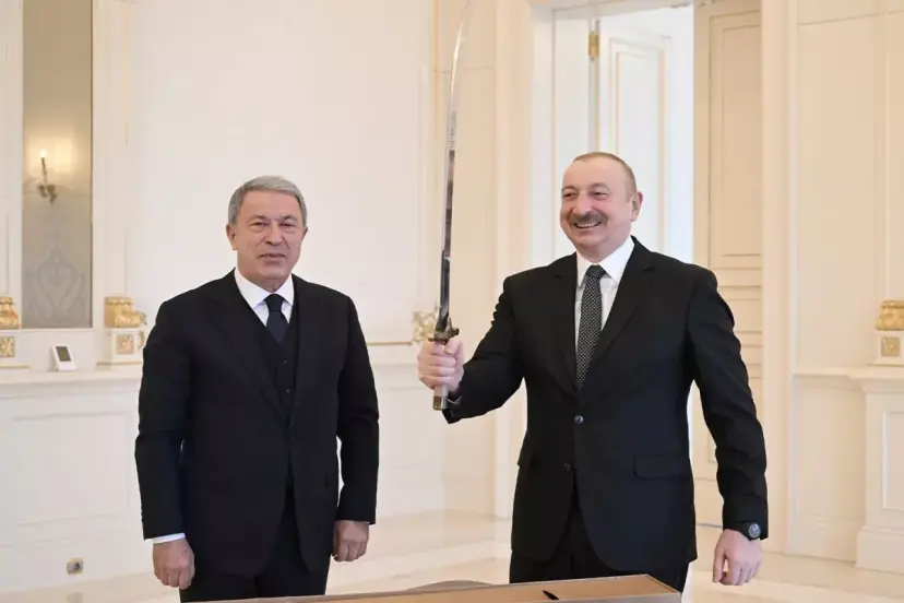 Eski Milli Savunma Bakanı Hulusi Akar, Azerbaycan Cumhurbaşkanı İlham Aliyev tarafından kabul edildi. Akar, Azerbaycan Cumhurbaşkanı Aliyev'e hatıra hediyesi olarak "Kılıç" takdim etti.