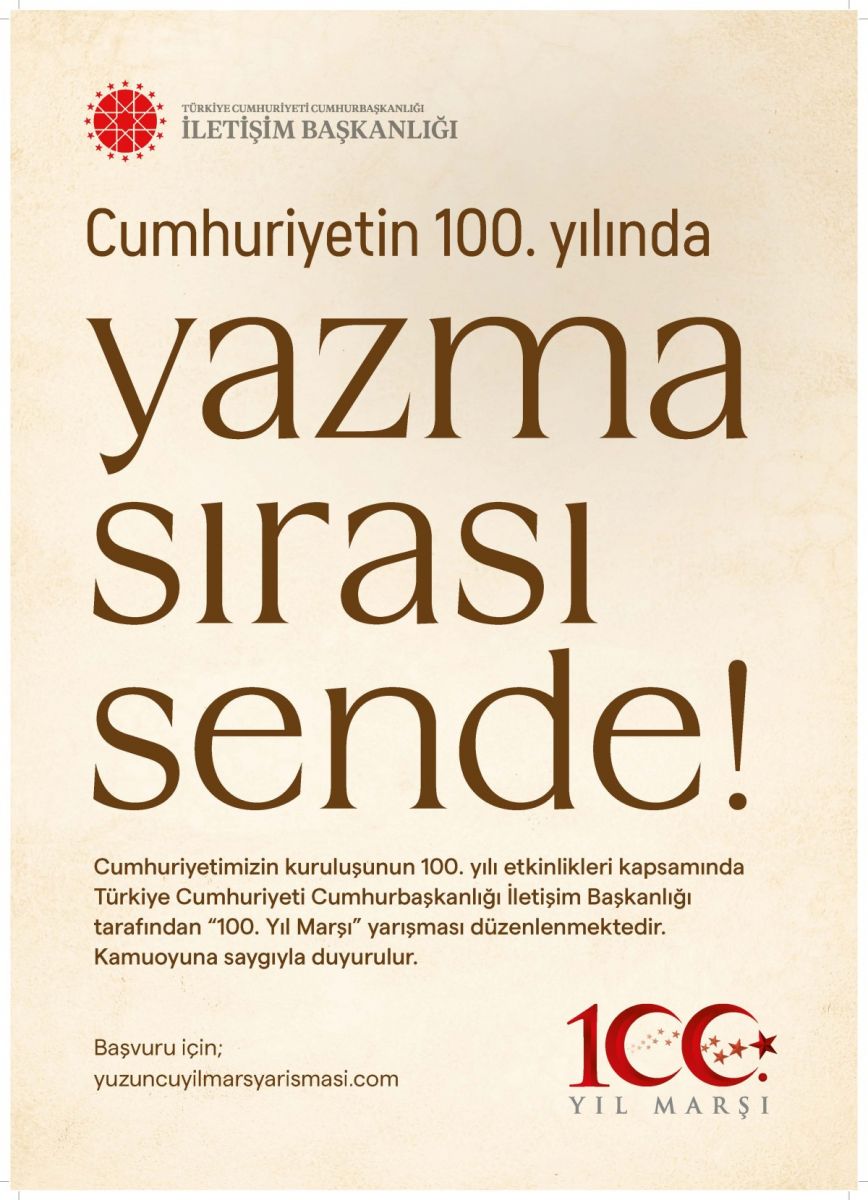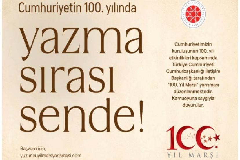 Cumhuriyetimizin kuruluşunun 100. yılı etkinlikleri münasebetiyle İletişim Başkanlığının koordinasyonunda, ülke çapında tüm vatandaşlarımızın katılabileceği “Yüzüncü Yıl Marşı Yarışması” düzenlenecek.