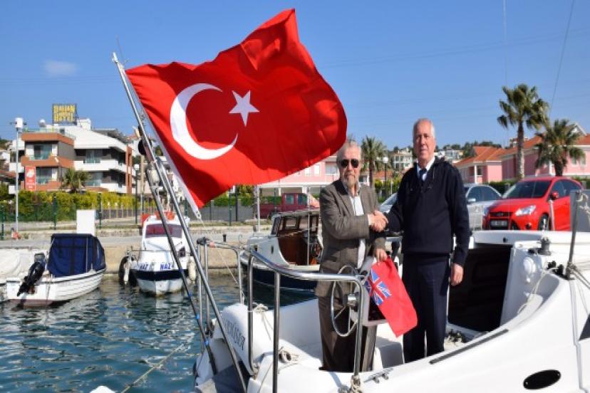 Çeşme’de Türk bayrağına geçen ilk tekne Kalamisia’nın sahibi Bilgisayar Mühendisi Prof. Dr. Cahit Aybet’e Çeşme Liman Başkanı Nihat Tozman tarafından bir Türk bayrağı hediye edildi.