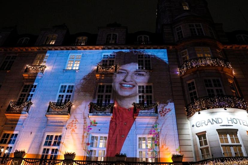 Nobel Ödüllü Narges Mohammad, Mahsa Amini'nin bir fotoğrafı ile poz veriyor. Elinde Farsça "Cinsiyet ayrımcılığına son" yazıyor, 4 Aralık 2024. Narges Foundation Archive/AP