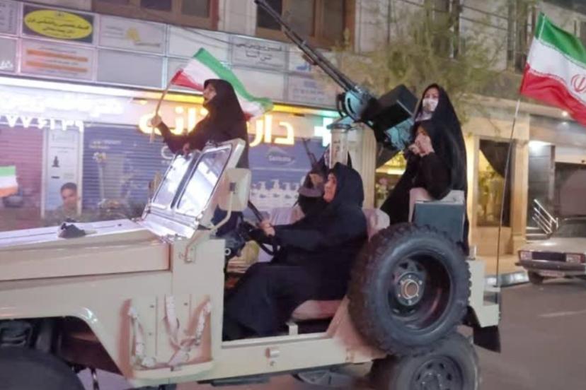 Tahran'da İranlı kadınlar, bir arabanın üzerinde silahlarla geçit töreni yaptı. Tahran'da akşam saatlerinde çatışmaların başladığı günden bu yana destek gösterileri düzeleniyor.
