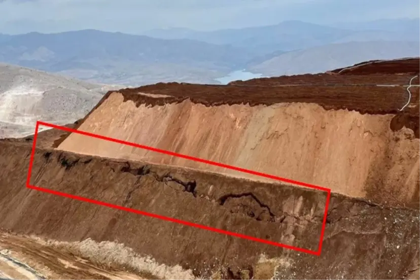 Fotoğraflarda siyanürden arındırılmış liç adı verilen toprakların istiflendiği alanda çatlaklar olduğu ve bir makinenin de çatlaklara saplanarak yana doğru eğildiği görüldü.