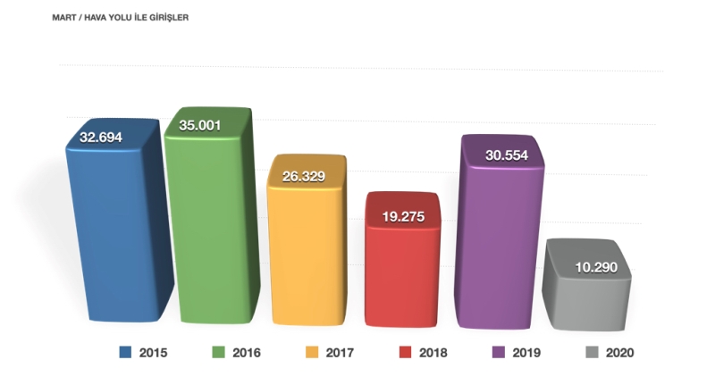 İzmir turizmi 2020 yılının Mart ayında 11 bin 920’si yabancı, 25 bin 196’sı vatandaş olmak üzere toplam 37 bin 116 ziyaretçi ağırladı. Mart ayında İzmir’e yabancı ziyaretçilerin 10 bin 290’ı hava yoluyla, 1630’u deniz yoluyla geldi. 2020 yılının Mart ayında yabancı ziyaretçilerin hava yoluyla girişleri bir önceki yıla göre yüzde 66 azalırken deniz yolu girişlerinde geçen yıla göre yüzde 77 azalma oldu.