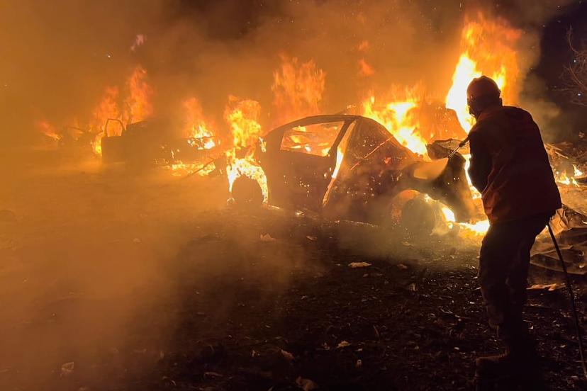 Kurtarma görevlileri, Beyrut'ta hasar gören araçlar arasında yangın çıkarken İsrail hava saldırısının gerçekleştiği yeri inceliyor, 1 Nisan 2026. AP Photo/Hussein Malla