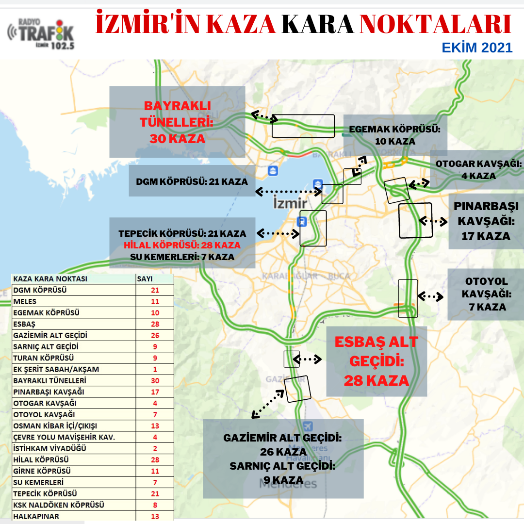Geride bıraktığımız ay meydana gelen bin 118 trafik kazasının ardından “kaza kara noktaları”nda değişiklik olmadı. Gaziemir Akçay Caddesi üzerinde bulunan ESBAŞ Alt Geçidi ve çevresi, Eylül ayına göre (47) azalış gösterse de 28 kaza ile yine kazaların sıklıkla görüldüğü bölgelerden biri oldu. Basmane-Kahramanlar ayrımını içinde barındıran, Yeşildere ile Mürselpaşa Bulvarı’nın kesiştiği Hilal Köprüsü üstünde de 28 trafik kazası oldu. Gaziemir Alt Geçidi 28, Tepecik ve DGM Köprüleri 21, Osman Kibar Tüneli 13, Girne Köprüsü olarak bilinen 10 Nisan Köprüsü 11, Ankara Caddesi üzerindeki EGEMAK Köprüsü ise 10 trafik kazasıyla kara kara noktaları olarak yine ön plana çıktı. Noktalar dikkate alınmadığında ise 161 kazanın olduğu çevre yolları dışında, Akçay Caddesi’nde 83, Yeşildere’de 71, Anadolu Caddesi’nde 70, Ankara Caddesi’nde 59, Mürselpaşa Bulvarı’nda 46, Mustafa Kemal Sahil Bulvarı’nda 41 trafik kazasına şahit olundu.