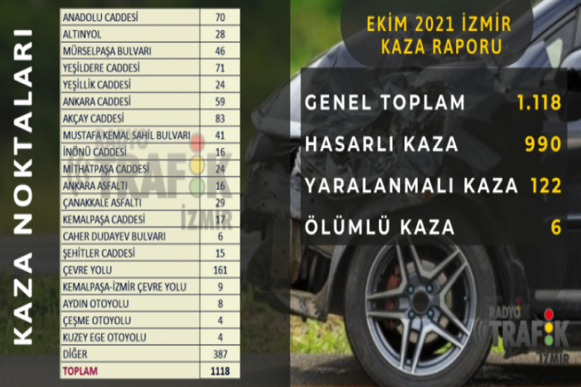 2021 Eylül ayı içerisinde İzmir’de 14 ölümlü, 151 yaralanmalı trafik kazası meydana gelmişti. Ekim ayında yaralanmalı kaza sayısı 122, ölümlü kaza sayısı ise 6 oldu. Ölümlü kazalardan 2’sine motosikletliler karıştı, bir kazada ise yaya hayatını kaybetti. Yaralanmalı kazaların 37’sinde motosiklet sürücüleri varken, 17 yaya da kazalarda yaralandı.