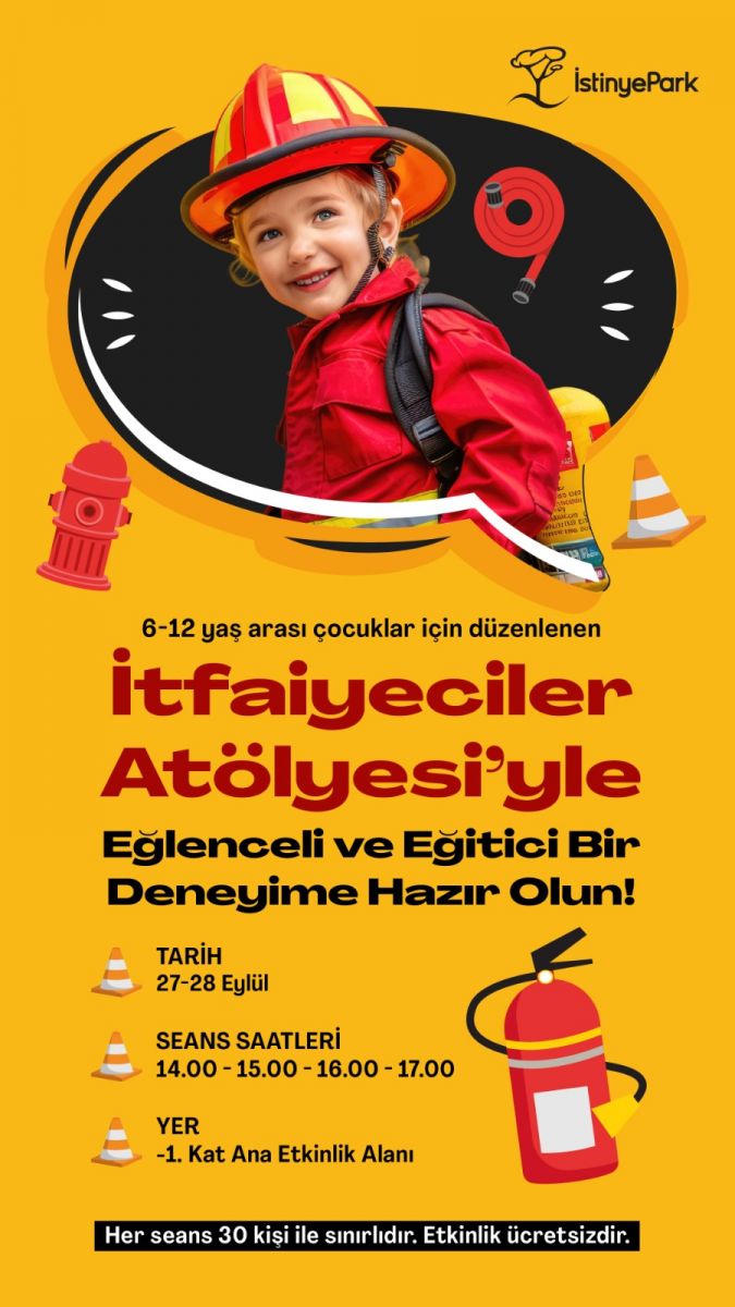 6-12 yaş arası çocuklar için düzenlenen İtfaiyeciler Atölyesi ile eğlenceli ve eğitici bir deneyim çocukları bekliyor.