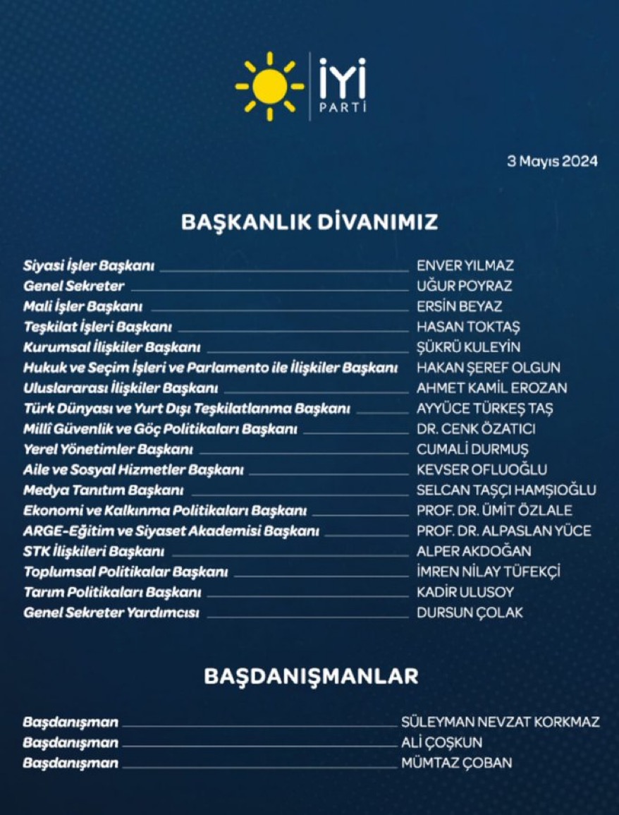 "Siyasi İşler Başkanı Enver Yılmaz, Genel Sekreter Uğur Poyraz, Mali İşler Başkanı Ersin Beyaz, Teşkilat İşleri Başkanı Hasan Toktaş, Kurumsal İlişkiler Başkanı Şükrü Kuleyin, Hukuk-Seçim İşleri ve Parlamento ile İlişkiler Başkanı Hakan Şeref Olgun, Uluslararası İlişkiler Başkanı Ahmet Kamil Erozan, Türk Dünyası ve Yurtdışı Teşkilatlanma Başkanı Ayyüce Türkeş Taş, Milli Güvenlik ve Göç politikaları Başkanı Cenk Özatıcı, Yerel Yönetimler Başkanı Cumali Durmuş, Aile ve Sosyal Hizmetler Başkanı Kevser Ofluoğlu, Medya Tanıtım Başkanı Selcan Taşcı Hamşıoğlu, Ekonomi ve Kalkınma Politikaları Başkanı Ümit Özlale, ARGE-Eğitim ve Siyaset Akademisi Başkanı Alpaslan Yüce, STK İlişkileri Başkanı Alper Akdoğan, Toplumsal Politikalar Başkanı İmren Nilay Tüfekçi, Tarım Politikaları Başkanı Kadir Ulusoy, Genel Sekreter Yardımcısı Dursun Çolak, Başdanışman Süleyman Nevzat Korkmaz, Başdanışman Ali Coşkun, Başdanışman Mümtaz Çoban."