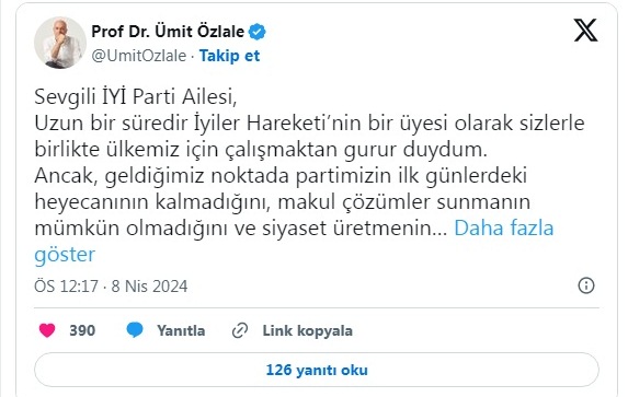 İYİ Parti'nin İzmir Büyükşehir Belediye Başkan adayı Ümit Özlale, partiden istifa kararı aldı.