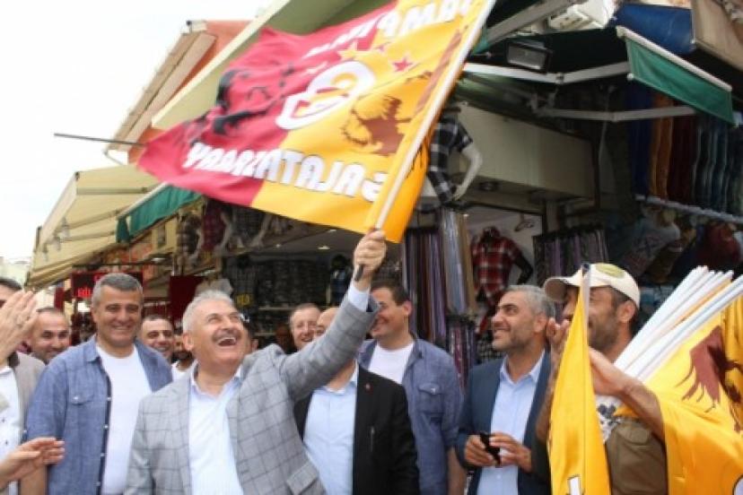Gördüğü ilgi nedeniyle ilerlemekte zorlandığı Kemeraltı çarşısında programı uzun süren Binali Yıldırım ile vatandaşlar bol bol fotoğraf çektirdi. Rastladığı bayrakçıdan Galatasaray bayrağını alıp sallayan Yıldırım, öte yandan Göztepe tezahüratı yaptı.