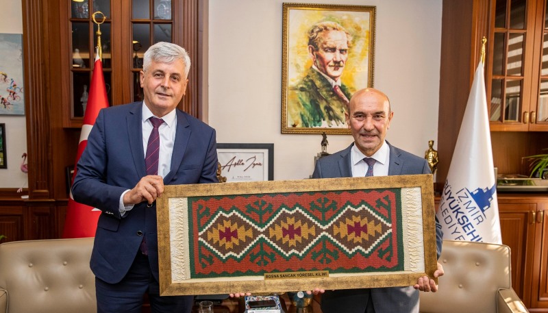 Görüşmenin ardından Dernek Başkanı Gül İzmir Büyükşehir Belediye Başkanı Tunç Soyer’e Boşnak böreği ve kök boyadan yapılmış Boşnak motifleri ile işlenmiş bir kilim hediye etti.
