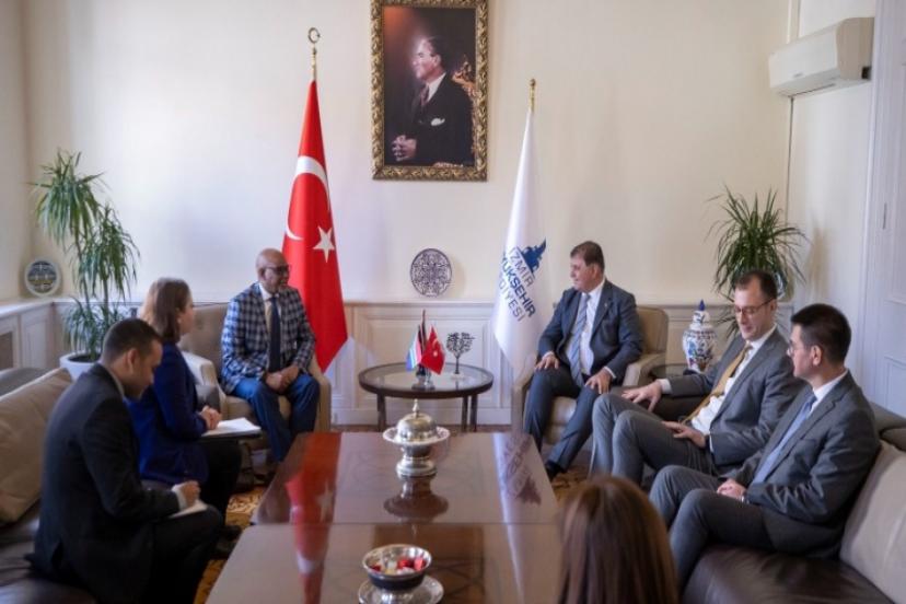 Güney Afrika'nın Cape Town Belediyesi'nden Kent Yöneticisi Lungelo Mbandazayo, İzmir Büyükşehir Belediye Başkanı Dr. Cemil Tugay'ı makamında ziyaret etti. Ziyarette İzmir Büyükşehir Belediyesi Genel Sekreteri Barış Karcı ve bürokratlar da yer aldı.