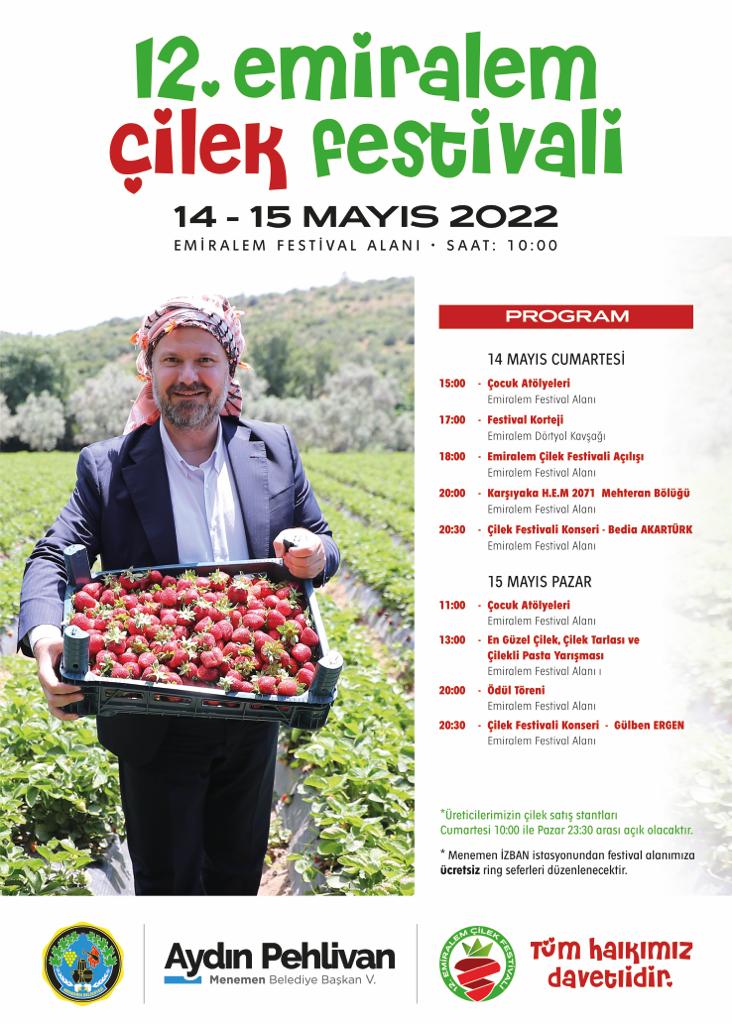 Bereketli Menemen Ovası’nda çok önemli tarım ürünleri yetiştiğine dikkat çeken Pehlivan, “Bu tarım arazileri içerisinde Emiralem bölgemizde kendisine has kokusu ve tadıyla yetişen çilek, en değerli ürünlerimizden biri. Bu yıl 2 bin dönüm alanda 7 bin ton Çilek hasatı gerçekleştirmeyi bekliyoruz. Bu kapsamda hem bölge üreticisine sahip çıkmak hem çileğimizin tanıtımına katkıda bulunmak hem de üretici ve tüketiciyi aynı bölgede buluşturmak için 14-15 Mayıs tarihlerinde Emiralem Çilek Festivalimizi gerçekleştireceğiz.‘Çilek Tadında Festival’ sloganıyla 12. kez düzenleyeceğimiz festivalimizde üretici, esnaf ve vatandaşımızın yüzü gülecek. Cadde ve sokaklarımız, iki gün boyunca çocuk atölyeleri, mutfak tadımları, müzik dinletileri ve ünlü isimlerin katılacağı konserlerle renklenecek. Festival coşkusunu hep birlikte yaşamak için tüm vatandaşlarımızı bu hafta sonu çilek diyarı Emiralem’e bekliyorum” diye konuştu.