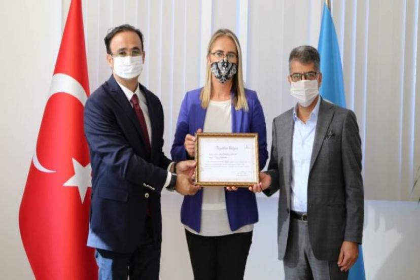 İzmir Milli Eğitim Müdürü Dr. Ömer Yahşi, uzaktan erişim engeli olan öğrencilere EBA sistemine uyumlu bin adet tablet ile eğitime vermiş olduğu destekten dolayı AK Parti İzmir Milletvekili Ceyda Bölünmez Çankırı ve eşi Talip Çankırı’ya teşekkür belgesi takdim etti.