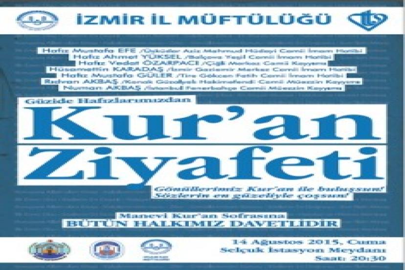 İzmir İl Müftülüğü Gönüllerimiz Kur’an buluşsun! Sözlerin en güzeli ile coşsun sloganıyla duyurduğu Kur’an ziyafeti 14 Ağustos Cuma günü Selçuk İstasyon meydanında Saat: 20.30’da gerçekleştirilecek.