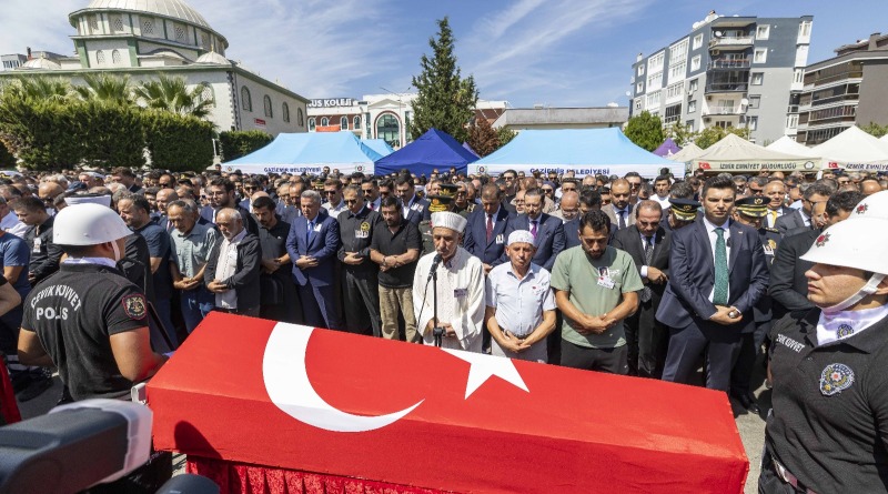 Şehitlerin cenaze namazı, Gaziemir 15 Temmuz Şehitler Camii’nde öğle namazını müteakip kılındı. Cenaze törenine Başkan Dr. Cemil Tugay’ın yanı sıra İçişleri Bakanı Ali Yerlikaya, İzmir Valisi Dr. Süleyman Elban, Ege Ordusu ve Garnizon Komutanı Orgeneral İrfan Özsert ve ordu mensupları, Cumhuriyet Halk Partisi Genel Başkan Yardımcısı Murat Bakan, İzmir İl Emniyet Müdürü Celal Sel ve emniyet mensupları, İzmir Cumhuriyet Başsavcısı Ali Yeldan, İzmir milletvekilleri, ilçe belediye başkanları, siyasi partilerin il ve ilçe başkanları, şehitlerin yakınları, çalışma arkadaşları, sivil toplum kuruluşlarının temsilcileri ve çok sayıda İzmirli katıldı.