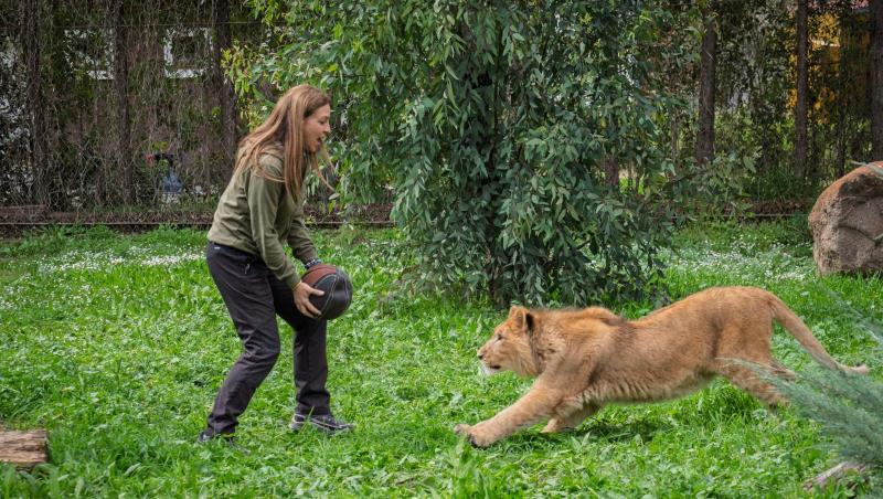 Doğal Yaşam Parkı’na getirildiğinde hiç et ile beslenmediği belirlenen yavru aslan için özel bir beslenme programı uygulanıyor. Sabah ve öğlen kırmızı et, kuru mama ve bir su bardağı tavuk suyu ile beslenen aslan, akşam da haşlanmış tavukgöğsü ve kuru mama tüketiyor. İnsanlarla yakın ilişki kurduğu belirlenen aslan gün içinde basketbol topu, halat topu ve şamandıra gibi oyuncaklarla oynayarak günlerini keyifle geçiriyor