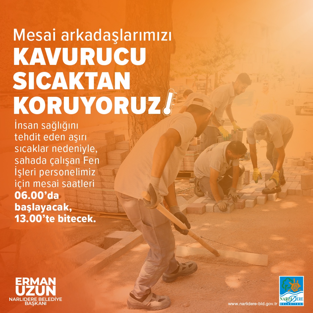 Kavurucu sıcakların halk sağlığını tehdit ettiğini söyleyen Narlıdere Belediye Başkanı Erman Uzun, “Yaz ayları ile birlikte artan sıcaklıklar hem sağlığı tehdit ediyor hem de sahada görevli personelimiz için çalışma koşullarını oldukça zorlaştırıyor. Narlıdereli komşularımız için sahada emek veren ve her zaman en iyisini yapmaya gayret eden mesai arkadaşlarımızı kavurucu sıcaklardan korumak için böyle bir karar aldık. Çok zor bir iş yapıyorlar ve beden gücü ile çalışıyorlar. Mesai saatlerinde yaptığımız düzenleme ile hem mesai arkadaşlarımız sıcaktan etkilenmeyecek hem de halka sunduğumuz hizmetler aksamayacak” dedi.