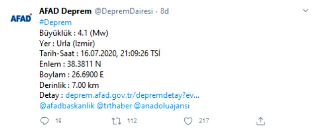 Afet ve Acil Durum Yönetimi Başkanlığının (AFAD) internet sitesinde yer alan bilgiye göre, saat 21.09'da İzmir'in Urla ilçesinde 4,1 büyüklüğünde deprem kaydedildi.