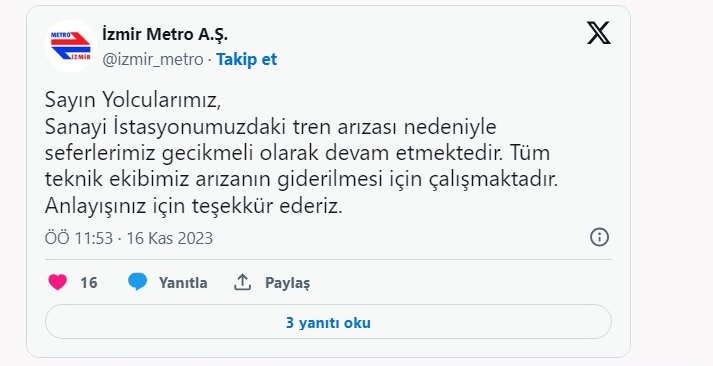 İzmir Metro'nun sosyal medya hesabından yapılan açıklamada, tren arızası nedeniyle seferlerin gecikmeli yapıldığı belirtildi.