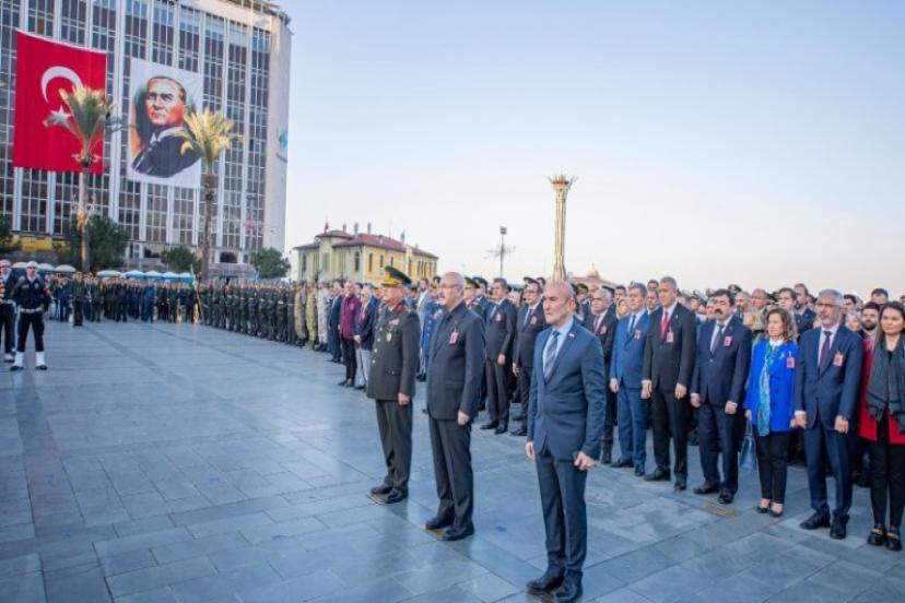 Saygı duruşunun ardından Cumhuriyet Meydanı’nda resmi anma programı yapıldı. Törene İzmir Valisi Yavuz Selim Köşger, Ege Ordusu ve Garnizon Komutanı Orgeneral Kemal Yeni ve İzmir Büyükşehir Belediye Başkanı Tunç Soyer, siyasi partilerin temsilcileri, iş dünyası, resmi kurum ve sivil toplum kuruluş temsilcileri katıldı. Törende Atatürk Anıtı’na çelenk bırakıldı.