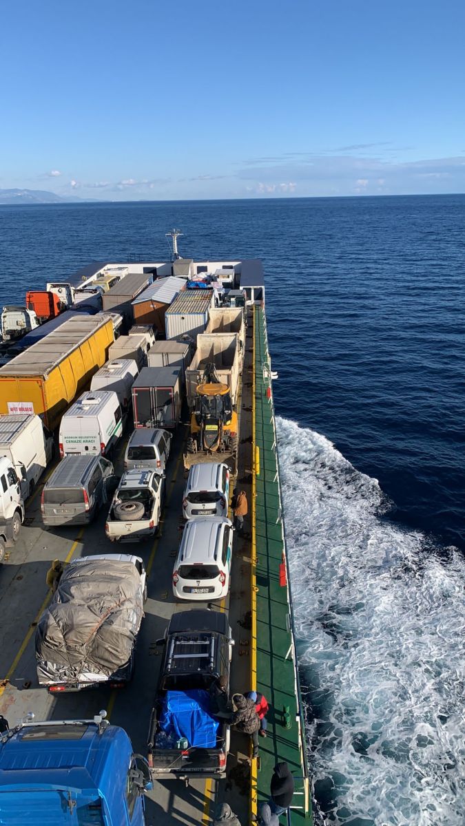Tekerlekli araç taşımacılığında kullanılan geniş kapasiteli bir gemi türü olan ro-ro gemisinde, 74’ü iş makinesi (vinç, ekskavatör, kırıcı vb.) olmak üzere içleri yardım malzemesi dolu tırlar, tankerler, otobüsler, minibüsler, karavanlar, konteynerler, tiny house, roll trailler’dan oluşan toplam 192 aracın yanı sıra 220 personel bulunuyor.