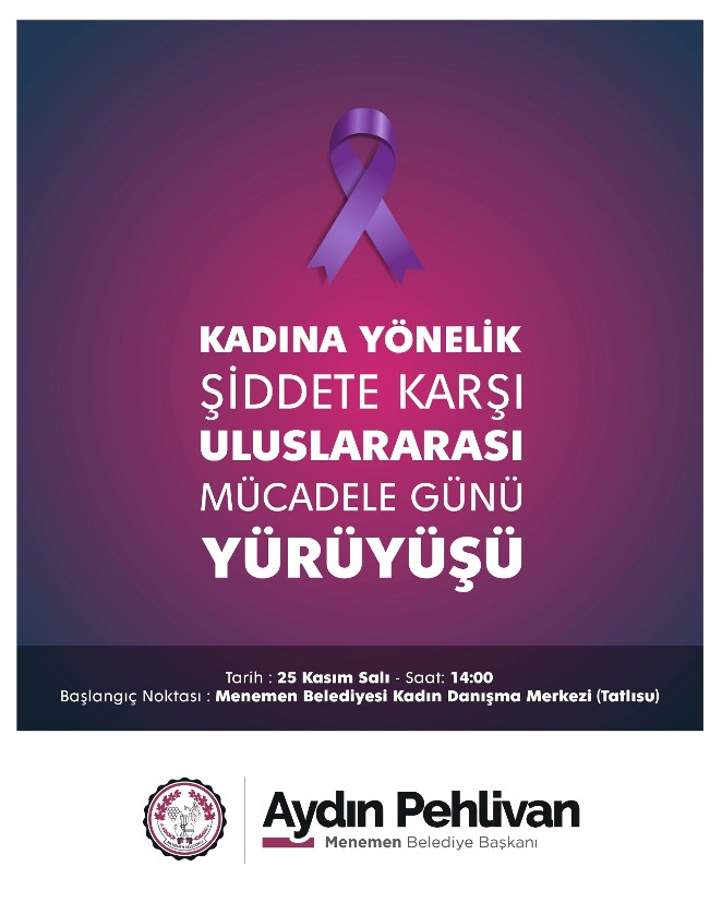 25 Kasım Kadına Yönelik Şiddete Karşı Uluslararası Mücadele Günü kapsamında, Menemen'de farkındalık etkinlikleri düzenlenecek. Menemen Belediyesi Kadın Danışma Merkezi önünden yürüyüşle başlayacak programlar, Menemen Belediyesi Meclis Salonu'nda sunumlarla devam edecek. Menemen Belediye Başkanı Aydın Pehlivan, "Kadına şiddetin karşısında olmaya devam edeceğiz." dedi.