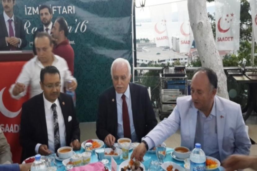 Saadet Partisi Genel Başkanı Mustafa Kamalak, İzmir İl Başkanlığı tarafından Hasan Sağlam Öğretmenevi’nde verilen iftar yemeğine katıldı. Sivil Toplum örgütleri ve bini aşkın teşkilat mensubunun katıldığı iftar programında Genel İdare Kurulu Üyesi ve İzmir İl Başkanı Bayram Sakartepe’nin selamlama konuşmasından sonra gündemi değerlendiren Saadet Partisi Genel Başkanı Kamalak, “Bizim yer almadığımız, Milli Görüş'ün bulunmadığı meclis, bu ülkenin, bu milletin hiçbir temel problemini çözemez" dedi.