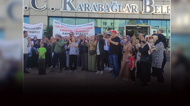 26 Mayıs 2025 Pazartesi günü saat 15.00’te Belediye önünde toplanan mağdurlar belediyenin tutumunu protesto etti. 2019 yılında yapılan kura ile Karabağlar’daki TOKİ projesinden ev sahibi olmaya hak kazanan 750 dar gelirli ve dezavantajlı aile, projenin sürekli ertelenmesi ve belediyenin sürece dair net bir tutum sergilememesi nedeniyle ciddi mağduriyet yaşıyor. Eylemde konuşan temsilciler, Karabağlar Belediye Başkanı Helil Kınay’a yöneltilen soruların yanıtsız kaldığını ve hak sahiplerinin aylardır randevu taleplerine cevap alamadığını dile getirdi.