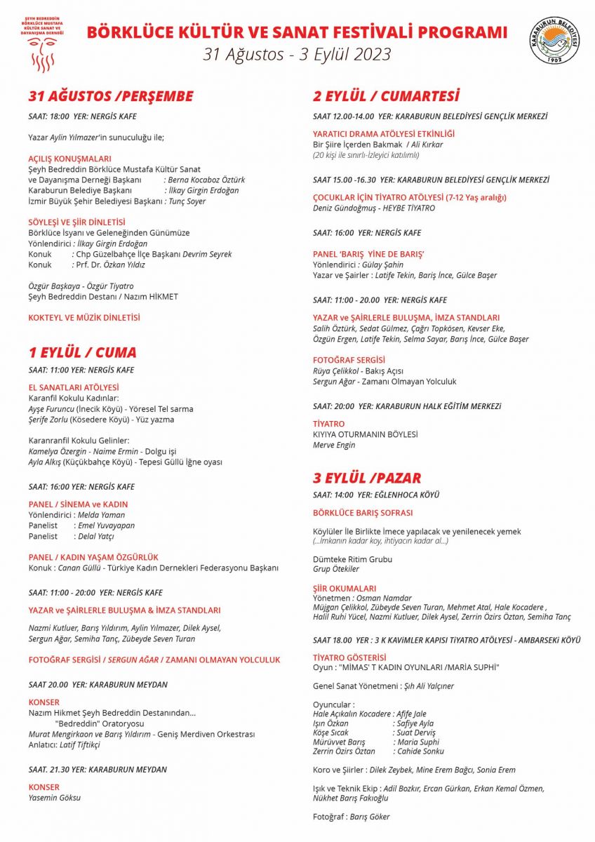 Karaburun Belediyesi ve İzmir Büyükşehir Belediyesi katkılarıyla Şeyh Bedrettin Börklüce Mustafa Kültür Sanat ve Dayanışma Derneği’nin düzenlediği 1. Börklüce Kültür Sanat Festivali, 31 Ağustos Perşembe günü Nergis Kafe’deki açılış töreniyle başlayacak. Dört gün sürecek festivalin teması “Barış, Yine de Barış!” olarak belirlendi. Karaburun Belediye Başkanı İlkay Girgin Erdoğan ve İzmir Büyükşehir Belediye Başkanı Tunç Soyer, katılımcılara, ev sahibi derneğin Başkanı Berna Kocaboz Öztürk ile birlikte seslenecekler. “Börklüce İsyanı ve Geleneğinden Günümüze” konulu söyleşide, Karaburun Belediye Başkanı İlkay Girgin Erdoğan yönlendiriciliğinde, ‘O Ses Türkiye’ programıyla adı hatırlanan aynı zamanda CHP Güzelbahçe İlçe Başkanı Devrim Seyrek ve Prof. Dr. Özkan Yıldız, konuşacak. Özgür Tiyatro’dan Özgür Başkaya Nazım Hikmet şiirlerinden dinleti sunacak.
