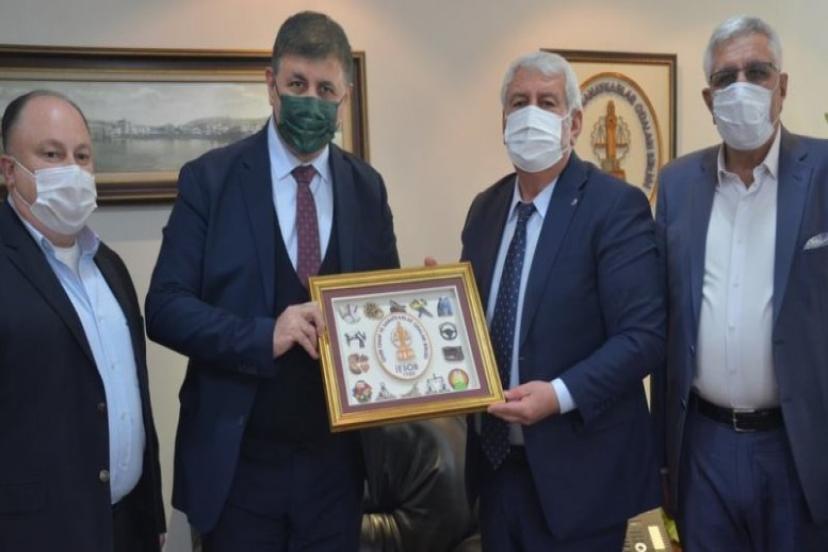 İzmir Esnaf ve Sanatkarlar Odaları Birliği (İESOB)’yi ziyaret eden Karşıyaka Belediye Başkanı Cemil Tugay, Birlik Başkanı Zekeriya Mutlu’ya esnaf sanatkarların sorunların çözümü için işbirliği teklifinde bulundu.