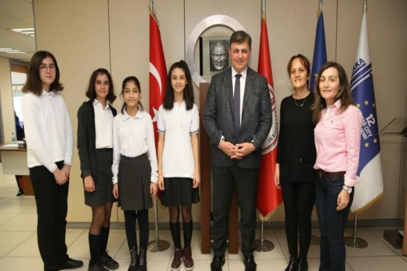 Avrupa’daki okulların bir araya gelerek ortak projeler ürettiği, bilgi ve deneyimlerini paylaştığı ‘eTwinnig’ platformuna katılan Karşıyaka Fevzipaşa Ortaokulu, iklim değişikliği konusunda farkındalık yaratmak ve çocukları bilinçlendirmek için harekete geçti. Okulda, Türkçe Öğretmenleri Ümmü Sayın ve Sevim Durgel Ammiler’in yürütücülüğünde, ‘Yedi İklim Dört Bucak İklim Değişikliği Masallarla Son Bulacak’ başlıklı eTwinnig projesi uygulanmaya başlandı. Çalışmalarını başarıyla sürdüren öğretmen ve öğrenciler, Karşıyaka Belediye Başkanı Dr. Cemil Tugay’ı ziyaret ederek proje hakkında bilgiler verdi. Öğrenciler ziyarette, sıfır atık ve geri dönüşüm konusunda istek ve önerilerini yazdıkları mektupları da Tugay’a teslim etti.