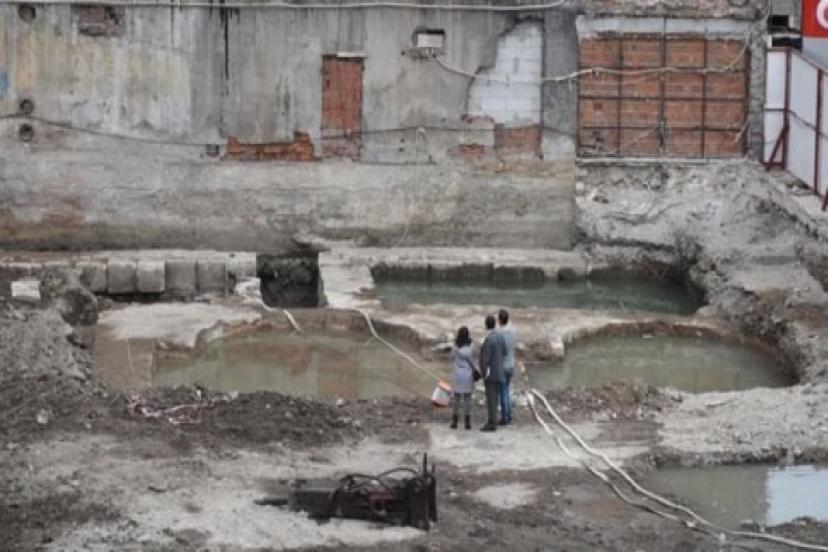 İzmir'de tarihi Kemeraltı Çarşısı'nda 4 ay önce yerine AVM yapmak için yıkılan binanın temelinde inşaat çalışmaları, ortaya çıkan tarihi kalıntılar nedeniyle durdurdu.
