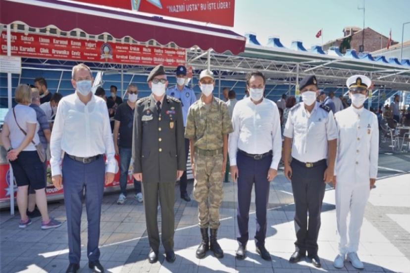 Ayvalık resmi protokol bayramlaşma töreni Cumhuriyet Meydanı’ndaki Ayvalıkgücü Çay Bahçesi’nde yapıldı. Törene Ayvalık Kaymakamı Gökhan Görgülüaslan, Ayvalık Garnizon Komutanı Albay Fevzi Koyuncu, Ayvalık Belediye Başkanımız Mesut Ergin, gaziler, belediye meclis üyeleri, siyasi parti temsilcileri, sivil toplum örgütleri temsilcileri, oda başkanları, daire amirleri ve çok sayıda vatandaş katıldı.