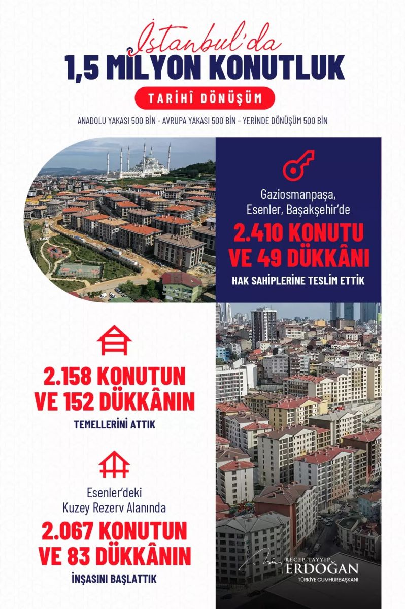 Çok daha büyük dönüşüm projesi başlatıyoruz. Her biri 500'er bin konuttan oluşan 3 ayrı projeyi hayata geçirmektir. Birincisi Avrupa yakasındaki rezerv alanlarımızda 500 bin konut yapmaktır. İkincisi Asya yakasında 500 bin konut yapmak. Üçüncüsü buralara taşıyacağımız nüfusla epeyce seyrelteceğimiz yerleşim yerlerinde 500 bin konutu yerinde dönüştürmektir. 6 milyon İstanbulluyu güvenli yuvalara kavuşturmuş olacağız. Şehrin trafiğini rahatlatacağız. Esenler projesi rezerv alanlardaki 100 bin konutluk dönüşümün ilk adımıdır. Bugün İstanbul'daki dönüşümün miladi olarak görüyoruz.
