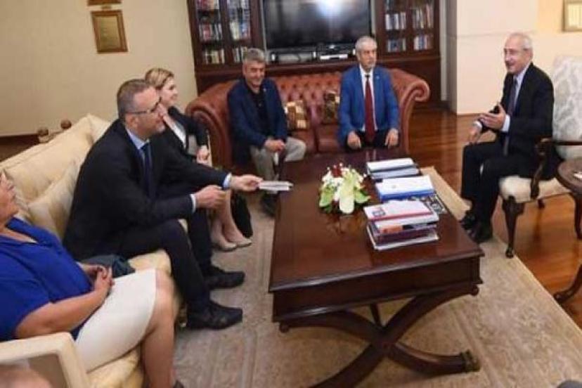 Kılıçdaroğlu görüşmede, ''Bence koalisyon olmayacak, perşembe günü açıklayacağız'' dedi.CHP Genel Merkezi'ndeki görüşmede Türk Tabipleri Birliği (TTB) Başkanı Dr. Bayazıt İlhan ve Genel Sekreteri Prof. Dr. H.Özden Şener, Türk Mühendis ve Mimar Odaları Birliği (TMMOB) Başkanı Mehmet Soğancı, Devrimci İşçi Sendikaları Konfederasyonu (DİSK) Başkanı Kani Beko ve Kamu Emekçileri Sendikaları Konfederasyonu (KESK) Eş Başkanı Şaziye Köse hazır bulundu.Kılıçdaroğlu'na Genel Başkan yardımcıları Selin Sayek Böke ve Yakup Akkaya da eşlik etti.