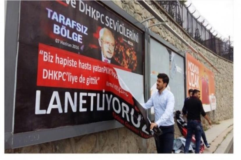 Kılıçdaroğlu'nun açıklamasının ve fotoğrafının olduğu bir afiş hazırlayan Gaziler Vakfı, "PKK ve DHKPC sevicilerini lanetliyoruz" mesajı yazarak bilboardlardlara yapıştırdı.
