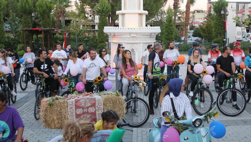 Kınık’ta Hasat ettikleri ürünlerle bisikletlerini süslediler