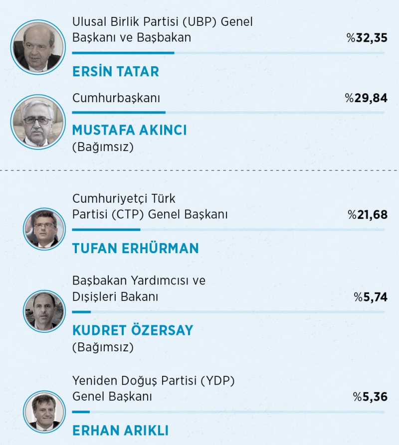 Kuzey Kıbrıs Türk Cumhuriyeti'nde (KKTC) bugün yapılan Cumhurbaşkanlığı seçimlerinde resmi olmayan sonuçlara göre yüzde 50'nin üzerinde hiç bir aday oy alamayınca, seçimler ikinci tura kaldı. 18 Ekim’deki ikinci turda, Başbakan Ersin Tatar ve Cumhurbaşkanı Mustafa Akıncı yarışacak. Sandıkların tamamı açılırken oyların yüzde 32,34'ünü elde eden Başbakan Tatar ilk sırada yer alıyor.