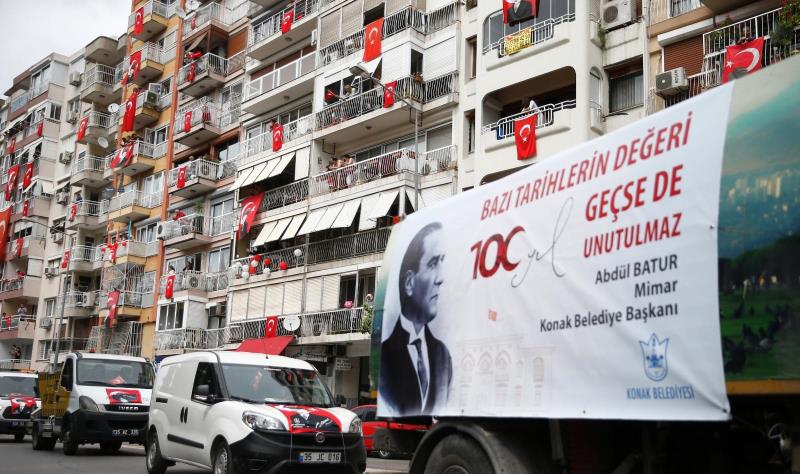 Bu yıl 23 Nisan’ın koronavirüs salgını önlemleri kapsamında dört günlük sokağa çıkma yasağına denk gelmesi ile Konaklılar Ulusal Egemenlik ve Çocuk Bayramı’nı evlerinde kutlarken, Konak Belediyesi konvoyu şehri turlayarak vatandaşların kutlamalarına eşlik etti.