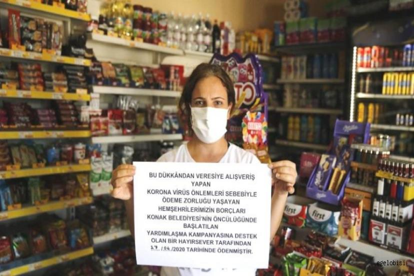 Konaklı esnaflar ise hayırseverlerin sağladığı destekleri, dükkanlarına astıkları yazılarla duyuruyor. Yazıda, borçların ne zaman ödendiği, “Bu dükkandan veresiye alışveriş yapan koronavirüs önlemleri sebebiyle ödeme zorluğu yaşayan hemşehrilerimizin borçları Konak Belediyesi’nin öncülüğünde başlatılan yardımlaşma kampanyasına destek olan bir hayırsever tarafından ödenmiştir” yazısıyla birlikte aktarılıyor.